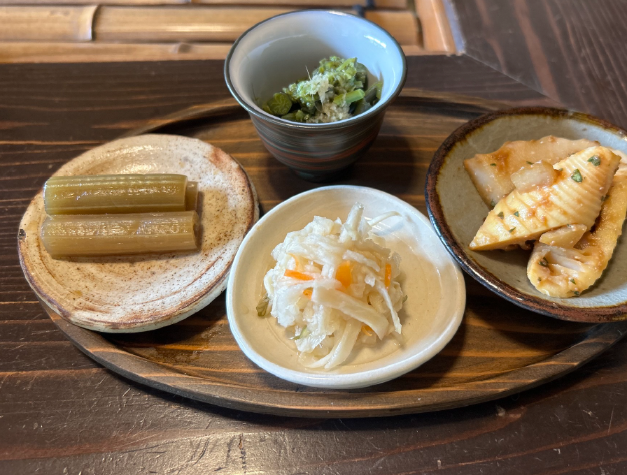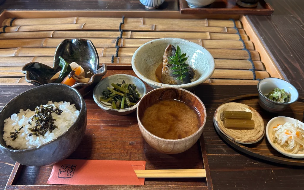 自家栽培の新鮮な無農薬野菜を中心に使い、一汁三菜と保存食で構成される郷土料理を提供する。化学調味料などを使わない素朴で安心できる味付けが評判で、都会の喧騒を離れ、心から安らげる場所として多くの人々が訪れる。